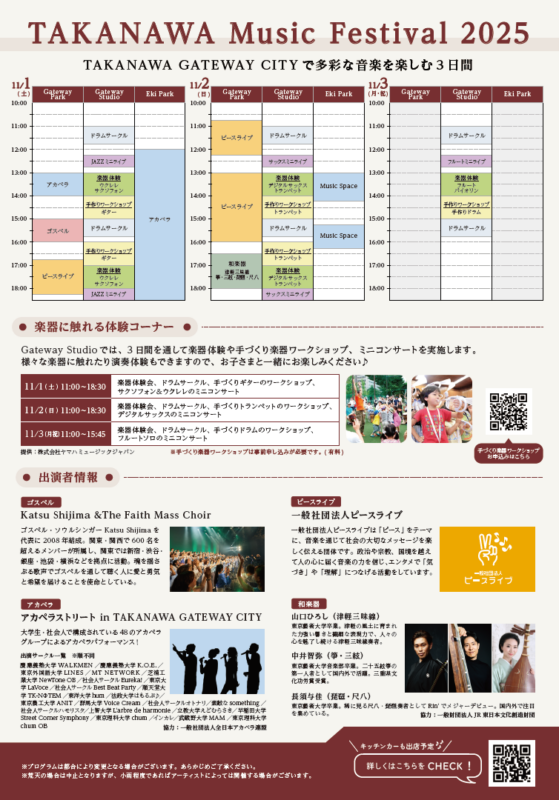 2025年11月1日(土)から11月3日(月・祝)の3日間、TAKANAWA Music Festival 2025を開催いたします。 「街を訪れるあらゆる人々が、多様な新しい音楽に出会える3日間」をテーマに、アカペラ、ジャズ、ポップスなど多様なアーティストが出演する3箇所のステージや、お子さまも楽しめる楽器体験会、楽器作りワークショップなどを開催します。